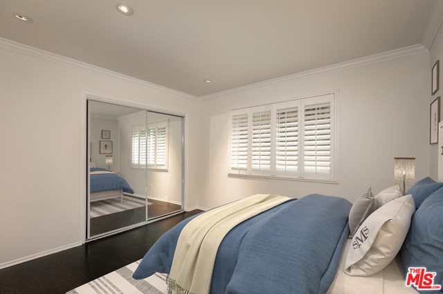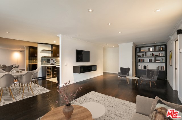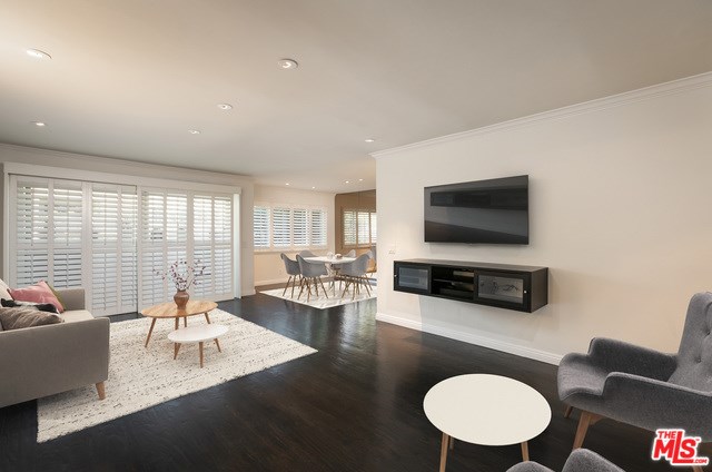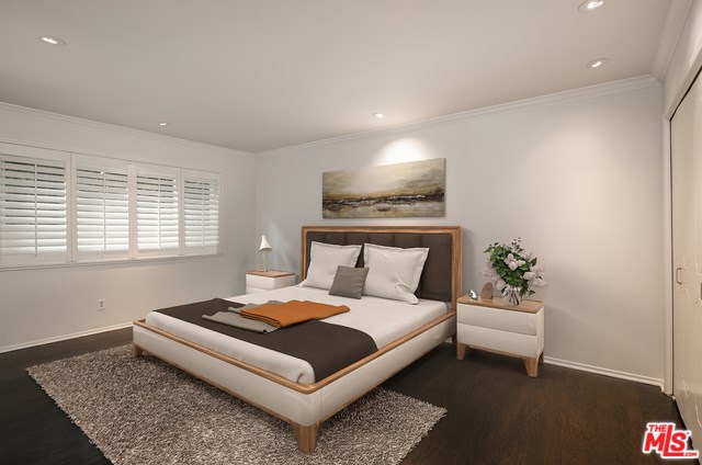 Polished contemporary, corner front facing unit in prime West Hollywood. With incredible walkability to LA's best dining, shopping and entertainment, this stunning property features hardwood floors, new paint, all new double paned windows for sound and energy efficiency, a private balcony, recessed lighting, crown molding and custom plantation shutters throughout. Open concept living/dining area with luxurious built-ins, spacious kitchen with custom cabinets, caesarstone countertops, sleek tile backsplash, wine fridge and stainless appliances. Oversized master suite with generous closet space and custom modern shower, 2nd bedroom with large closet and zen vibe full bath with deep soaking tub. Rare side by side parking in a beautiful complex with sun filled central courtyard and pool in an unbeatable location. HOA fees include EQ insurance.
